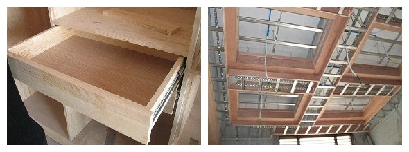 ● 抽屜高度120mm-140mm,木工板制作框架,碼釘固定。橫面木工板切面應用膩子上油;