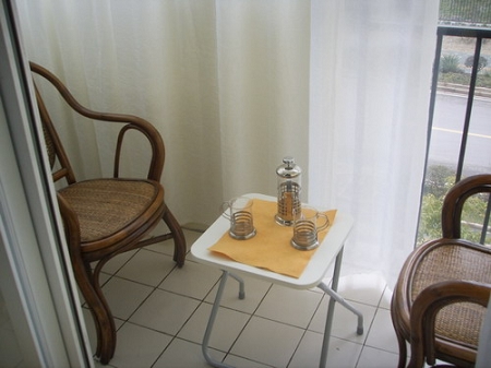 透過紗簾看小小的陽臺