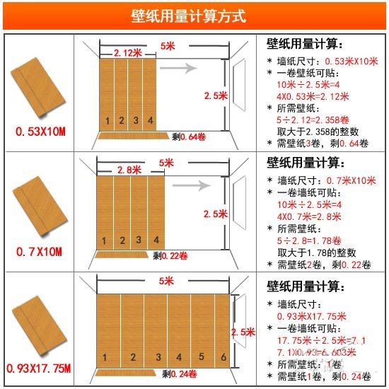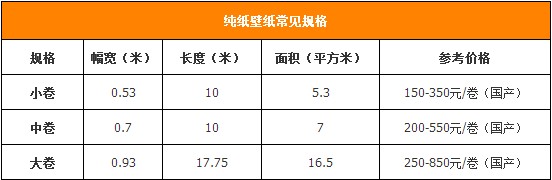 在選擇壁紙的時候,除了要看適用空間外,還需要看空間的面積,根據實際的面積來挑選不同尺寸的壁紙。純紙壁紙的常見尺寸有三種,0.53x10米/卷、0.7x10米/卷和0.93x17.75米/卷。如:一個5mx2.5m的墻面鋪貼壁紙,小卷壁紙需要購買3卷、而中卷需要2卷、大卷的需要1卷。