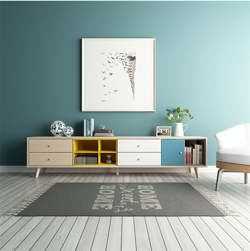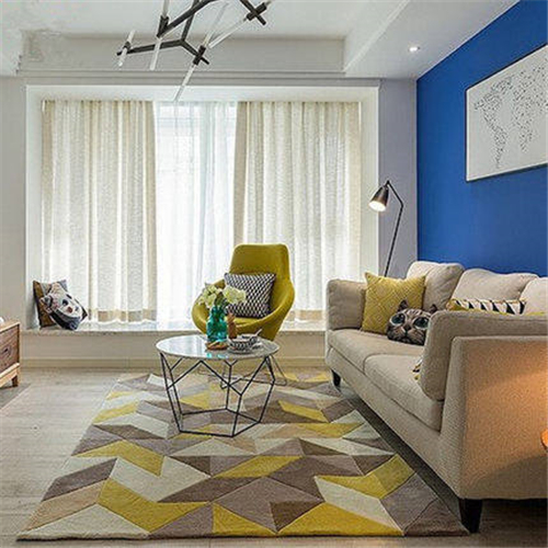 客廳是家里走動十分頻繁的地方,所以在地毯的選擇方面好選擇耐磨、顏色耐臟的地毯。 幾何圖案的的地毯十分適合低矮的茶幾,這樣的組合方式令現代客廳顯得生氣勃勃。不規則形狀的地毯也可以放在單張椅子下面增加家居質感。