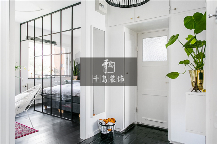 可以明顯看出,客廳與臥室只用了一道黑框玻璃門隔斷,透明光感增加了整體環(huán)境的通透性,但黑色的框線卻強調(diào)了兩個空間,線條明朗交錯之間,既有北歐風(fēng)的自由風(fēng)情,又有輕工業(yè)的規(guī)整有序,這種輕微卻極具沖擊力的混搭效果讓人眼前一亮。