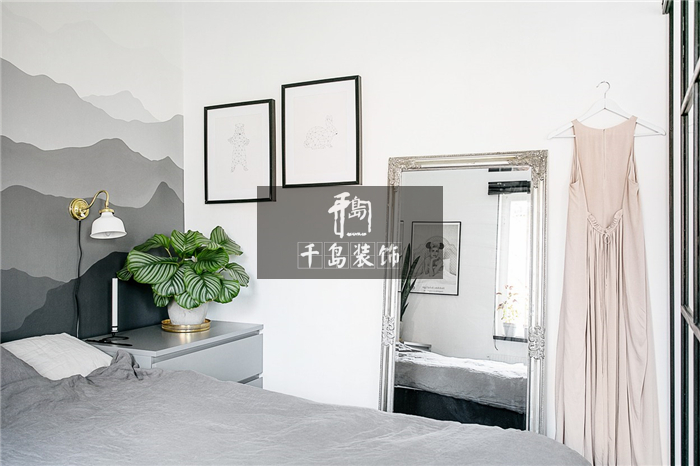 無論是灰白黑等冷色調(diào)的運用,還是大片的空間留白,臥室內(nèi)部更多地還是彰顯出濃郁的北歐風(fēng)情。但巧妙地將色澤變化運用其中,墻壁一面由深及淺的灰色增加了空間的層次感,另一面用黑框裝飾畫強調(diào)北歐風(fēng)主題,其中金屬壁燈的點綴便不顯突兀又獨具魅力了。