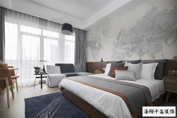 我真是沒有想到臥室能夠裝修的這么寬敞大氣,主要是格局劃分非常棒,樣板間在裝修的時(shí)候把陽臺(tái)與臥室打通,這樣使得空間進(jìn)一步得到了擴(kuò)展,另外在背景墻上采用高級(jí)灰色的格調(diào),上面還有世界地圖的圖案,將臥室映襯的非常宏偉壯觀。
