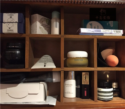 隱形支架的實木隔板上,各種護膚品、彩妝、吹風機、隱形眼鏡護理產品,分門別類,齊齊整整。