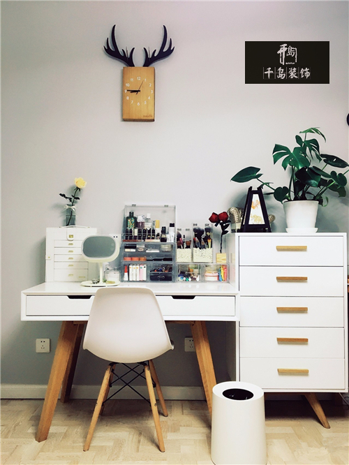 作為一個美妝愛好者,化妝區怎么可以不夠大!妝臺實際上是個書桌,配上同系列的斗柜收納各種囤貨,每天坐在這里心情都格外舒暢啊~
