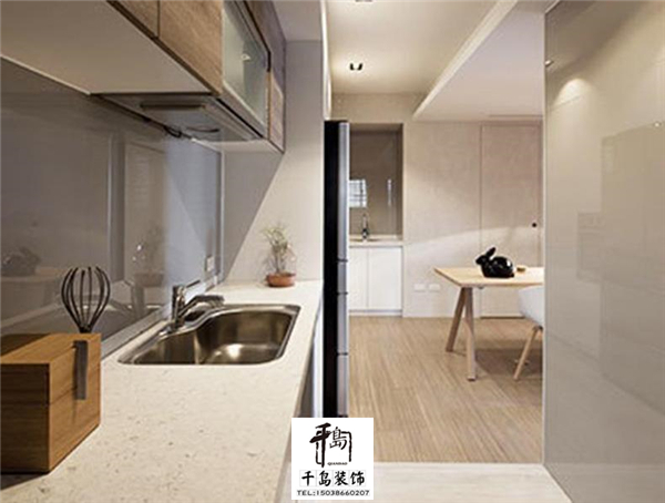 廚房打造的是開放式的設計,只不過空間比較小,所以就分了兩部分櫥柜打造,整體感覺不僅顯得廚房空間大,而且格局的設計也很符合我們現代年輕人的生活習慣。櫥柜的安裝也是原木與白色相間,呈現一種很簡約北歐的格調。