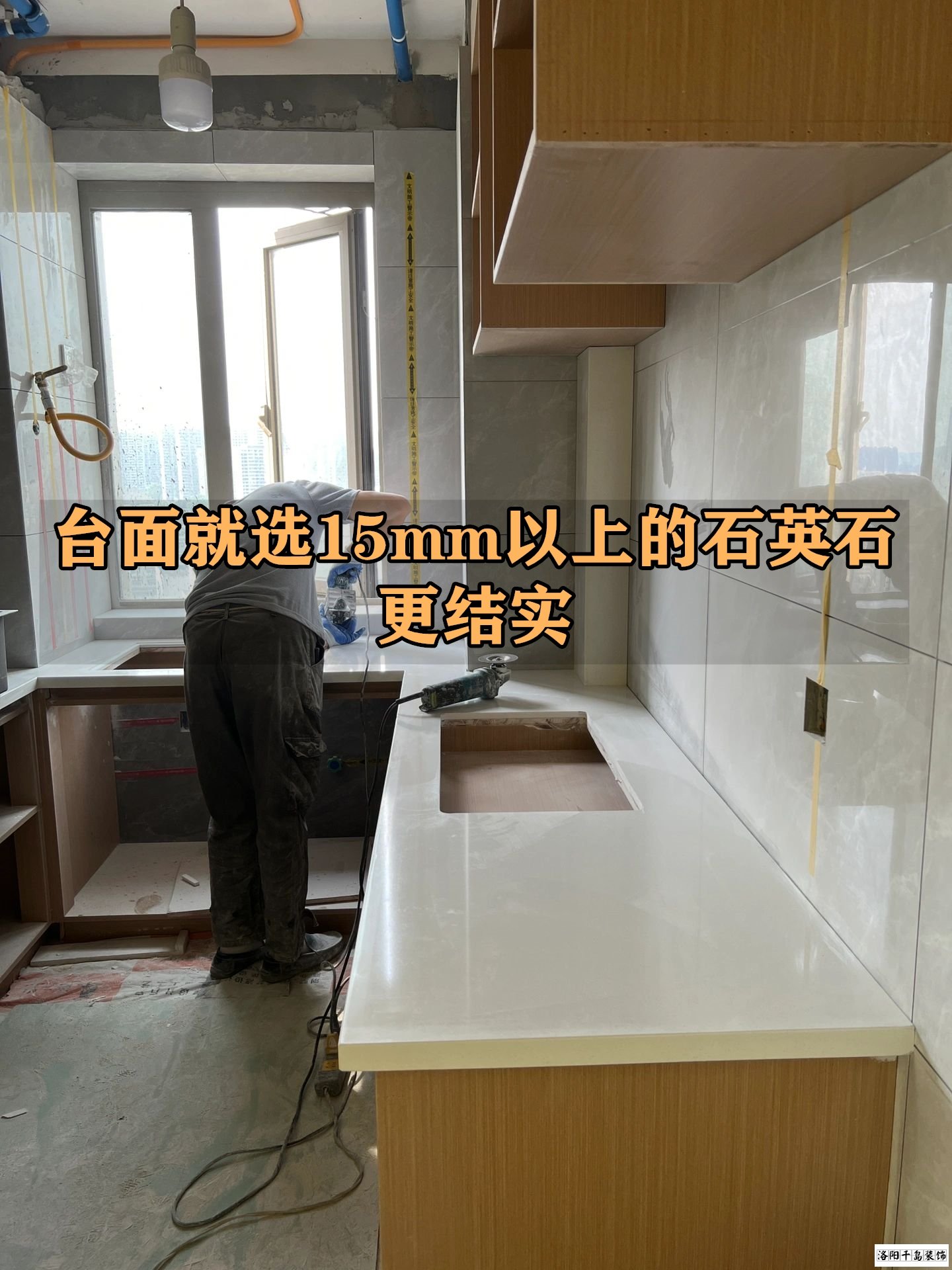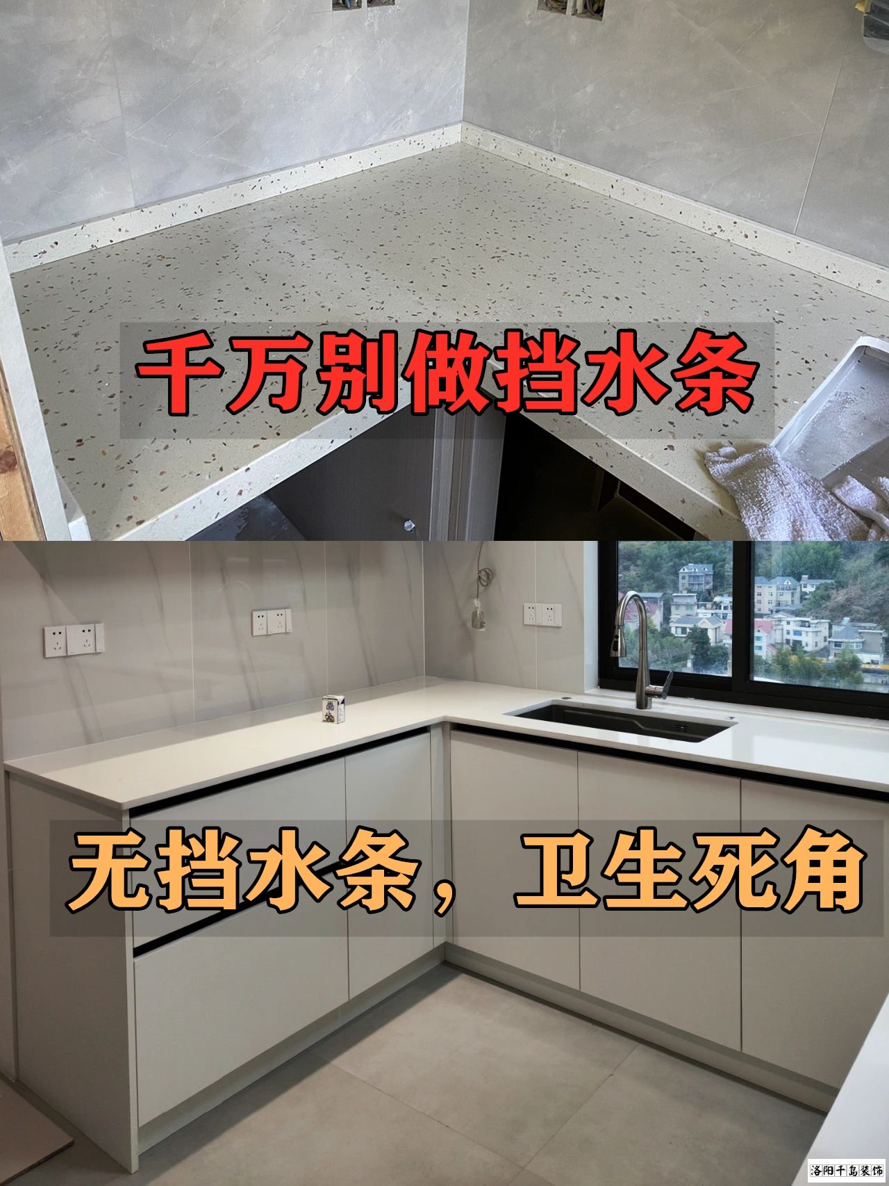 首先,臺面不要再做這種擋水條了,多兩到膠,時間久了肯定會受潮發黑的,根本清理不干凈。它的作用其實就是遮墻和柜子之間的縫隙,我們只要在瓦工階段囑咐好工人師傅把墻貼平,像這樣不做擋水條,衛生死角少了不說,臺面又寬兩公分。