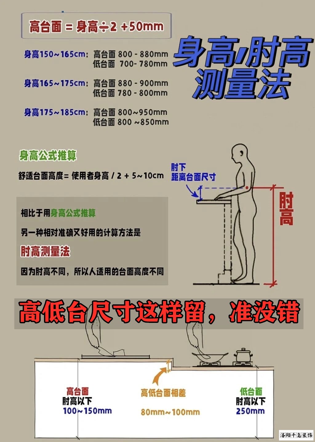 另外櫥柜要想好用,一定要做這種高低臺的,高度差呢,最好在八到十公分,這樣呢,炒菜我就不用抬胳膊了,切菜呢,洗菜我們不用彎腰,整個做飯都是舒服的,臺面具體的高度你就套上這個公式就行。