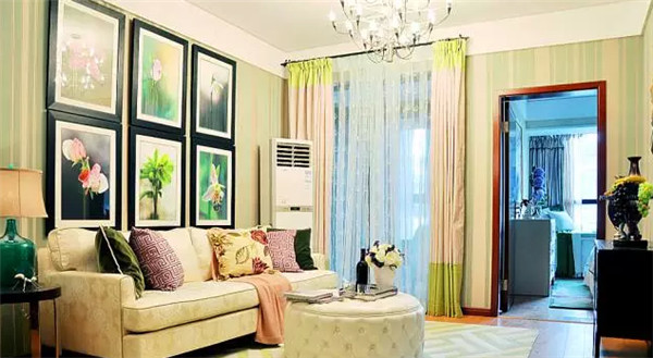把自己的攝影作品加入自家的墻面裝飾,以花為主題,貫穿家的整體搭配,經(jīng)濟(jì)又獨(dú)特.墻紙的顏色跟窗簾地毯進(jìn)行呼應(yīng),一個綠意濃濃的客廳溫馨又舒適。