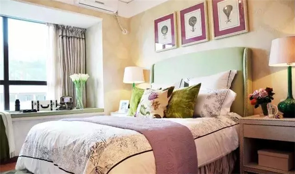 抹茶綠的軟包床搭配薰衣草紫的床品和掛畫,用淺米色墻紙鋪墊,淡淡的花香縈繞臥室,不想睡個好覺都難。